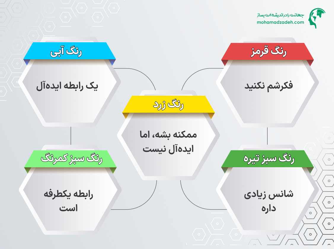 این رنگها به ترتیب، اولویت سازگاری شما با سایر تیپهای شخصیتی را مشخص میکند. البته باید توجه داشته باشید که این نمودار، فقط تایپها را براساس مکمل بودن دستهبندی کرده است، یعنی اگر شما درونگرا هستید، یک برونگرا مکمل شماست. ولی قطعا خیلی از افراد ترجیح میدهند با شخصی شبیه خودشان در ارتباط باشند، چون تفاهم و در صلح بودن با خود در رابطه حرف اول را میزند.
